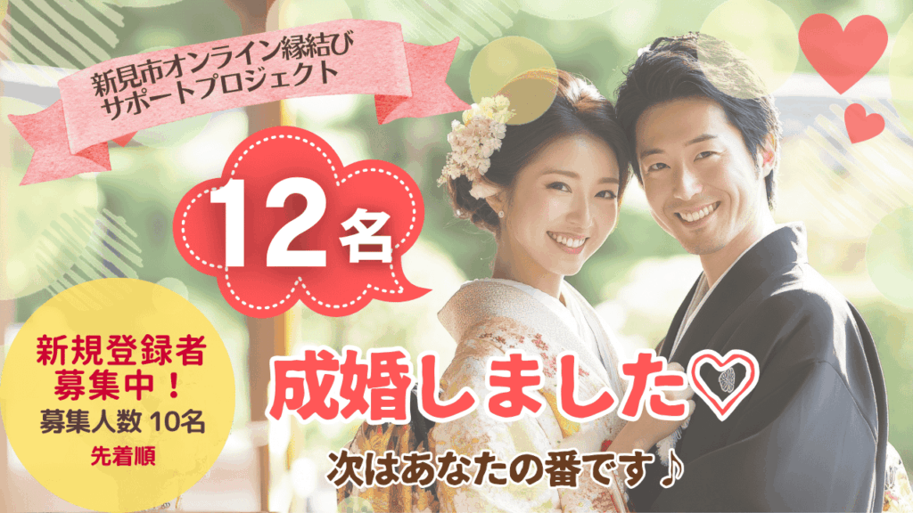 新見市にお住まいの結婚を希望する独身男女の皆さまに素敵な出会いを見つけていただくために『結婚応援プロジェクト事業』として、1対1のお見合いシステムをお得にご利用できる特別プランをご用意いたしました。2021年にスタートしたこの事業で12名がご成婚しました♡